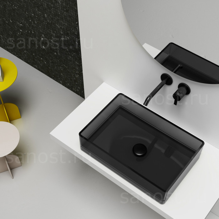 Раковина выполнена в прямоугольной форме, что добавляет ей современный и стильный вид, а прозрачный черный цвет создает эффект глубины и эксклюзивности. Изготовленная из прочной полиэфирной смолы, она сочетает в себе легкость и надежность, что делает её идеальным выбором для любого интерьера.