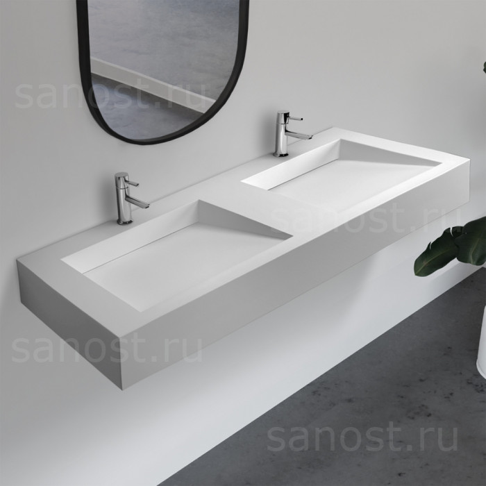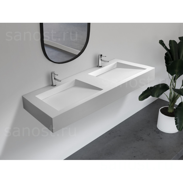 Раковина изготовлена из высококачественного искусственного камня, что обеспечивает её долговечность и легкость в уходе. Матовая поверхность придаёт изделию строгость и утонченность, а продуманная форма позволяет удобно использовать обе чаши одновременно.