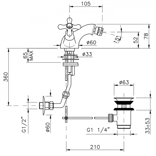 С высотой излива 105 мм, смеситель обеспечивает комфортное использование и легкий доступ. В конструкции предусмотрен донный клапан, что делает его эксплуатацию еще более удобной, обеспечивая надежное управление подачей воды.