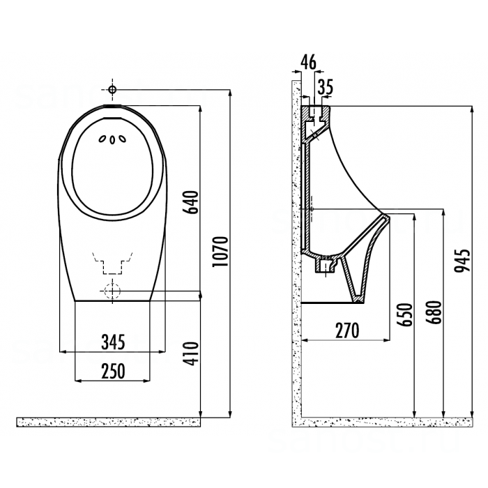 Технические характеристики CREAVIT Писсуар (верхняя подводка) с сифоном TP611.00000+1217