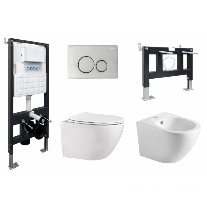Комплект ABBER унитаз AC1100 белый с инсталляцией AC0105 и кнопкой AC0121 хром, биде AC1150 с инсталляцией AC0101P, Безободковый, функция Антивсплеск, Антигрязевое покрытие, сиденье в комплекте, режим смыва: двойной,