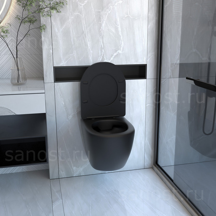 Комплект ABBER унитаз AC1100MB черный матовый с инсталляцией AC0105 и кнопкой AC0121MB, биде AC1150MB с инсталляцией AC0101P, Безободковый, функция Антивсплеск, Антигрязевое покрытие, сиденье в комплекте, режим смыва: двойной, материал клавиши - металл, цвет клавиши черный матовый