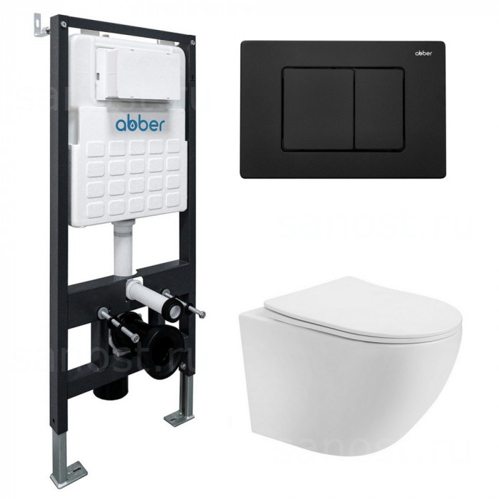 Комплект подвесной унитаз ABBER Bequem AC1100T белый с инсталляцией AC0105 и кнопкой AC0120MB черный матовый, Безободковый, функция Антивсплеск, Антигрязевое покрытие, сиденье в комплекте, режим смыва: торнадо, материал клавиши - металл, цвет клавиши черный матовый