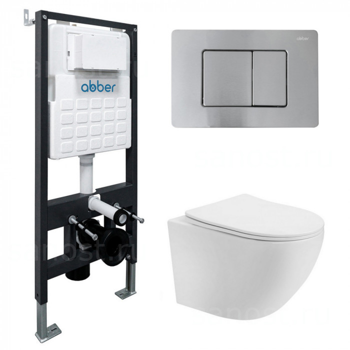 Комплект подвесной унитаз ABBER Bequem AC1100T белый с инсталляцией AC0105 и кнопкой AC0120MCH матовый хром, Безободковый, функция Антивсплеск, Антигрязевое покрытие, сиденье в комплекте, режим смыва: торнадо, материал клавиши - металл, цвет клавиши матовый хром