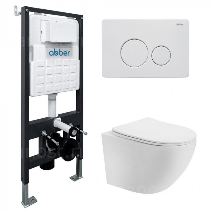 Комплект подвесной унитаз ABBER Bequem AC1100T белый с инсталляцией AC0105 и кнопкой AC0121MW белая матовая, Безободковый, функция Антивсплеск, Антигрязевое покрытие, сиденье в комплекте, режим смыва: торнадо, материал клавиши - металл, цвет клавиши белая матовая