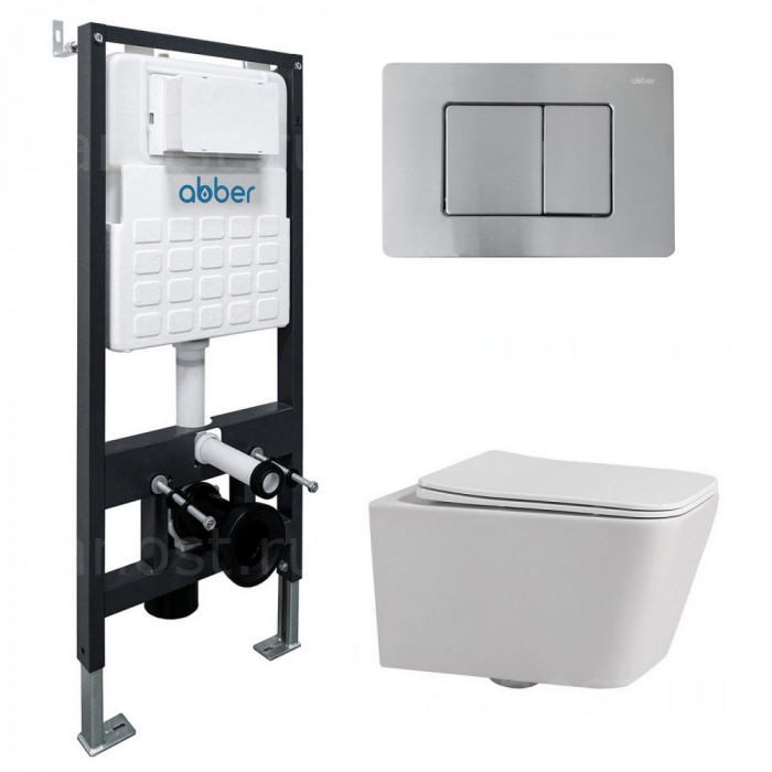 Комплект подвесной унитаз ABBER Rechteck AC1201 белый с инсталляцией AC0105 и кнопкой AC0120MCH матовый хром, Безободковый, функция Антивсплеск, Антигрязевое покрытие, сиденье в комплекте, режим смыва: каскадный, материал клавиши - металл, цвет клавиши матовый хром