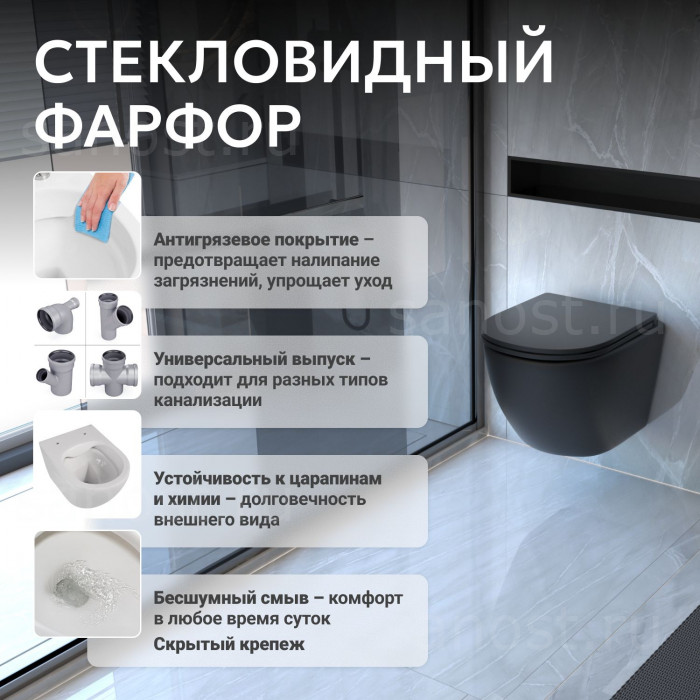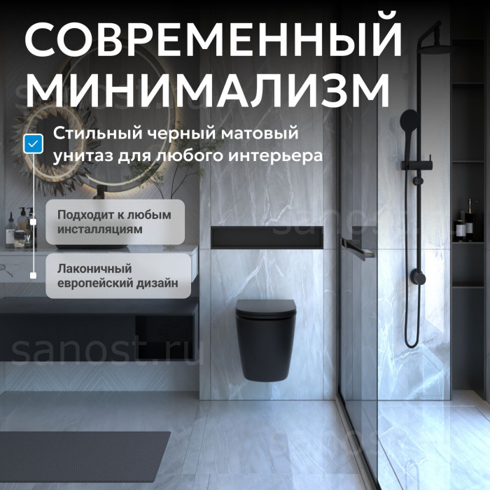 Унитаз ABBER BEQUEM AC1100MB подвесной черный матовый, безободковый, Безободковый, функция Антивсплеск, Антигрязевое покрытие, сиденье в комплекте, режим смыва: каскадный, высококачественная керамика устойчивая к царапинам, температура обжига более 1200°C, металлическая немецкая фурнитура