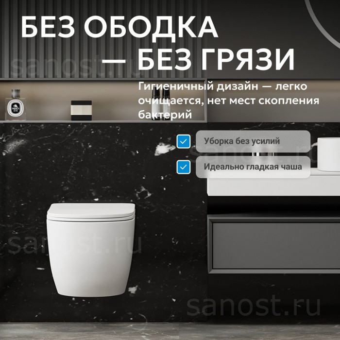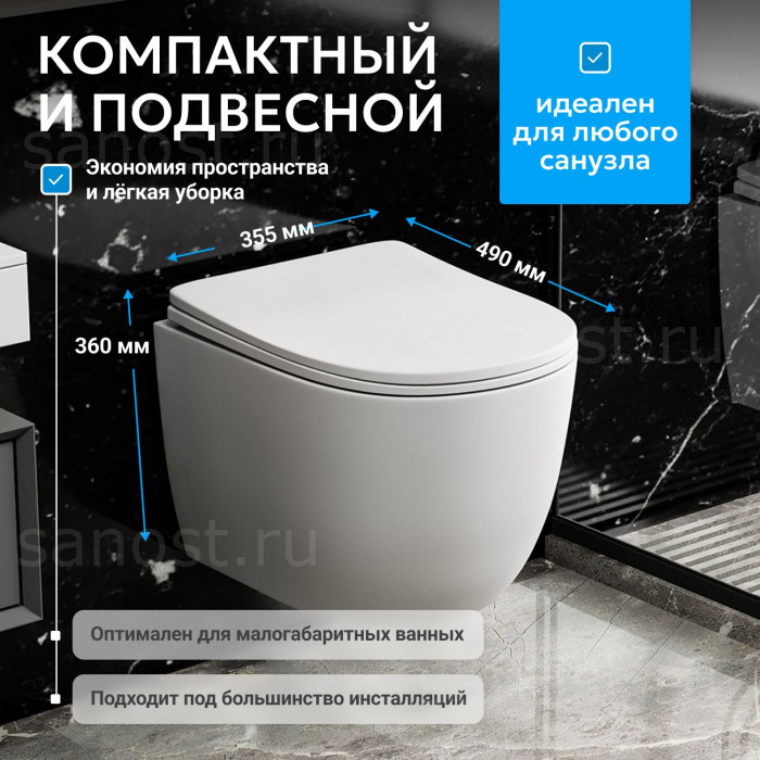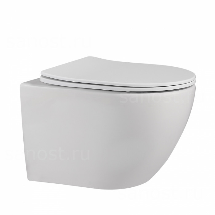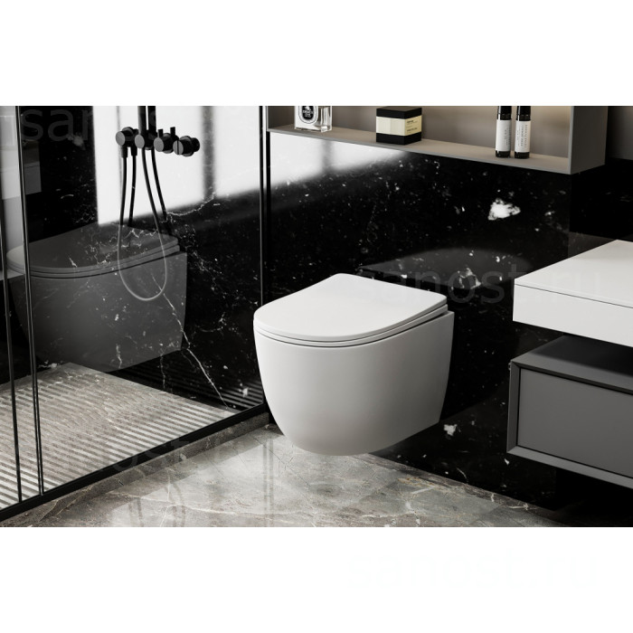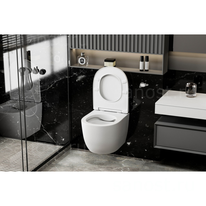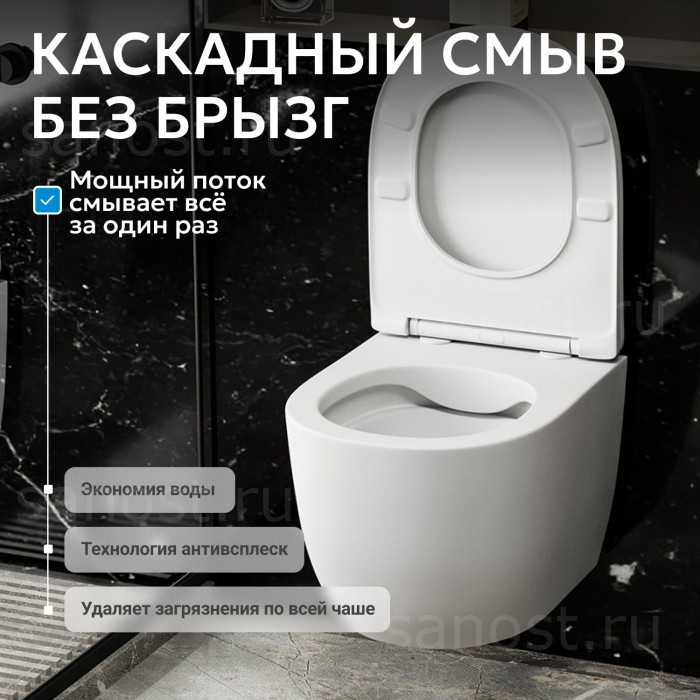 Унитаз ABBER Bequem AC1100MW подвесной белый матовый, безободковый, Безободковый, функция Антивсплеск, Антигрязевое покрытие, сиденье в комплекте, режим смыва: каскадный, высококачественная керамика устойчивая к царапинам, температура обжига более 1200°C