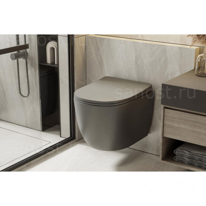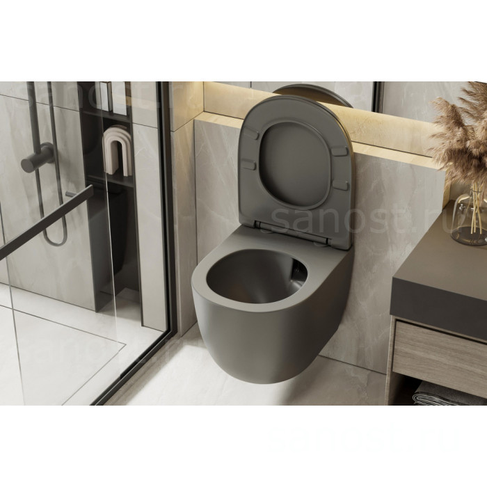 Унитаз ABBER Bequem AC1101TMG подвесной серый матовый, безободковый, смыв торнадо, Безободковый, функция Антивсплеск, Антигрязевое покрытие, сиденье в комплекте, режим смыва: торнадо,