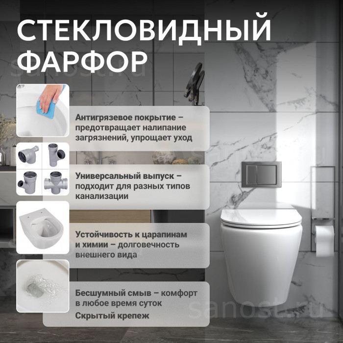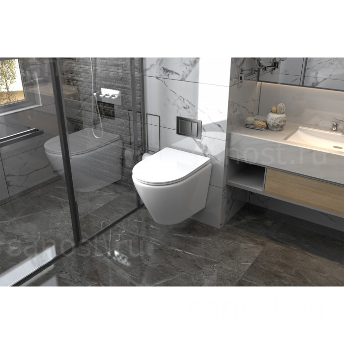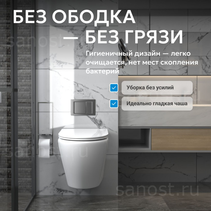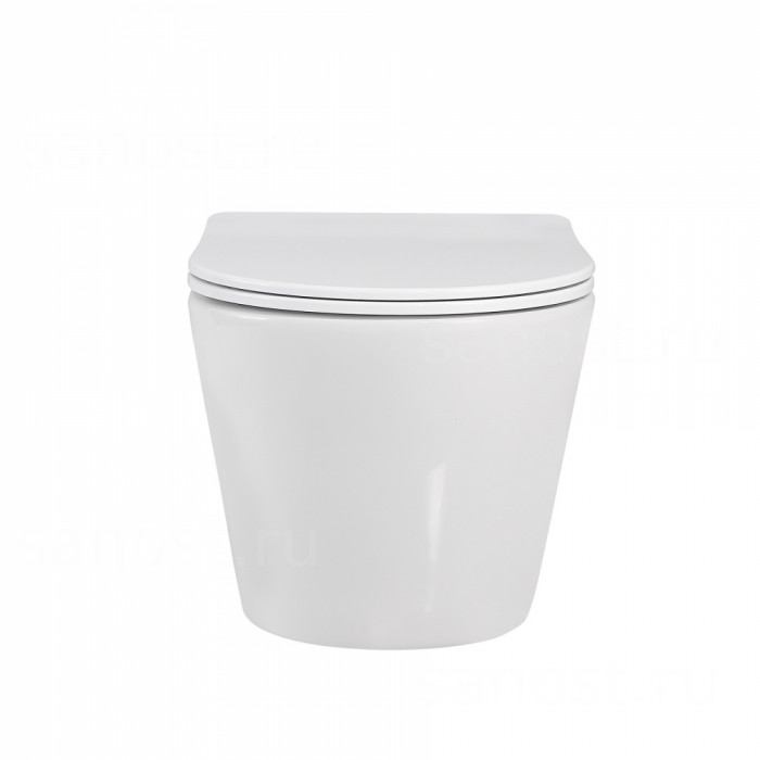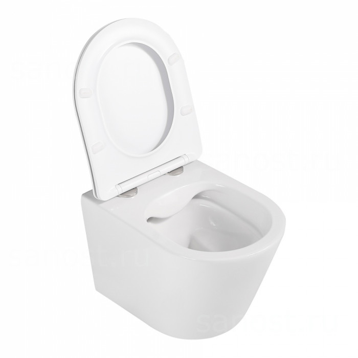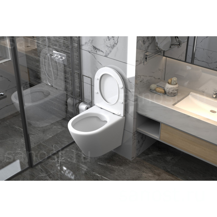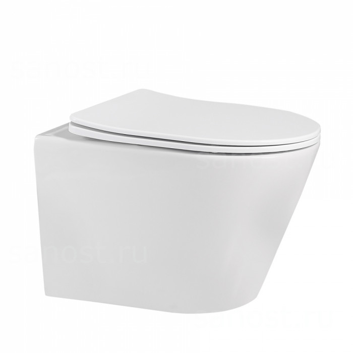 Унитаз ABBER Bequem AC1102 подвесной белый, безободковый, Безободковый, функция Антивсплеск, Антигрязевое покрытие, сиденье в комплекте, режим смыва: каскадный, высококачественная керамика устойчивая к царапинам, температура обжига более 1200°C, металлическая немецкая фурнитура
