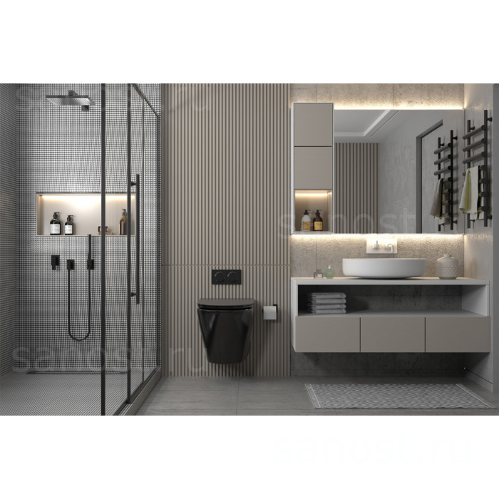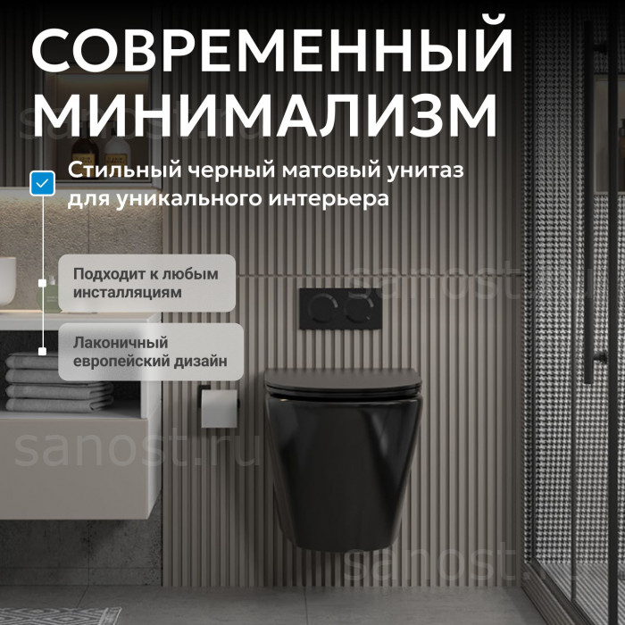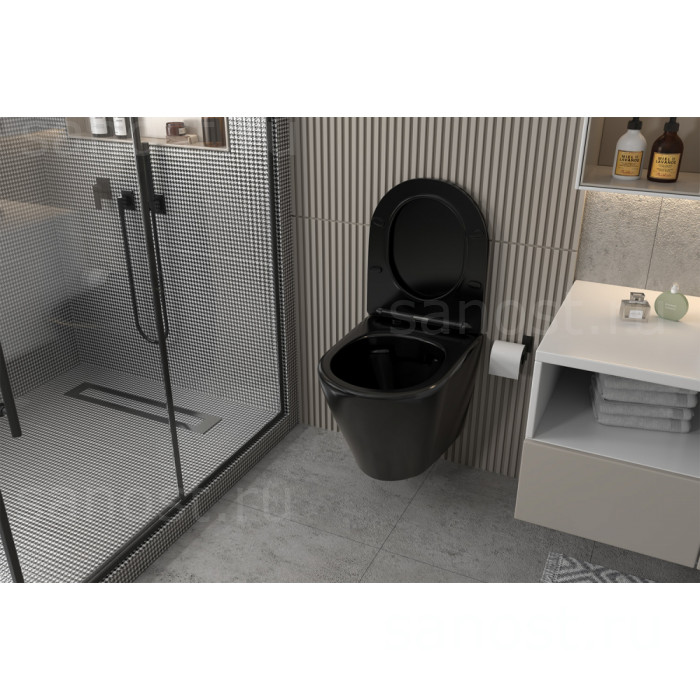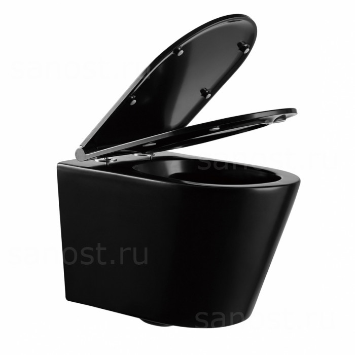 Унитаз ABBER Bequem AC1102MB подвесной черный матовый, безободковый, Безободковый, функция Антивсплеск, Антигрязевое покрытие, сиденье в комплекте, режим смыва: каскадный, высококачественная керамика устойчивая к царапинам, температура обжига более 1200°C, металлическая немецкая фурнитура