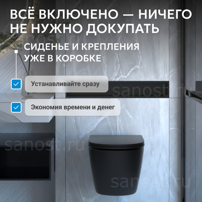 Унитаз ABBER Bequem AC1103MB подвесной черный матовый, безободковый, Безободковый, функция Антивсплеск, Антигрязевое покрытие, сиденье в комплекте, режим смыва: каскадный, высококачественная керамика устойчивая к царапинам, температура обжига более 1200°C, металлическая немецкая фурнитура