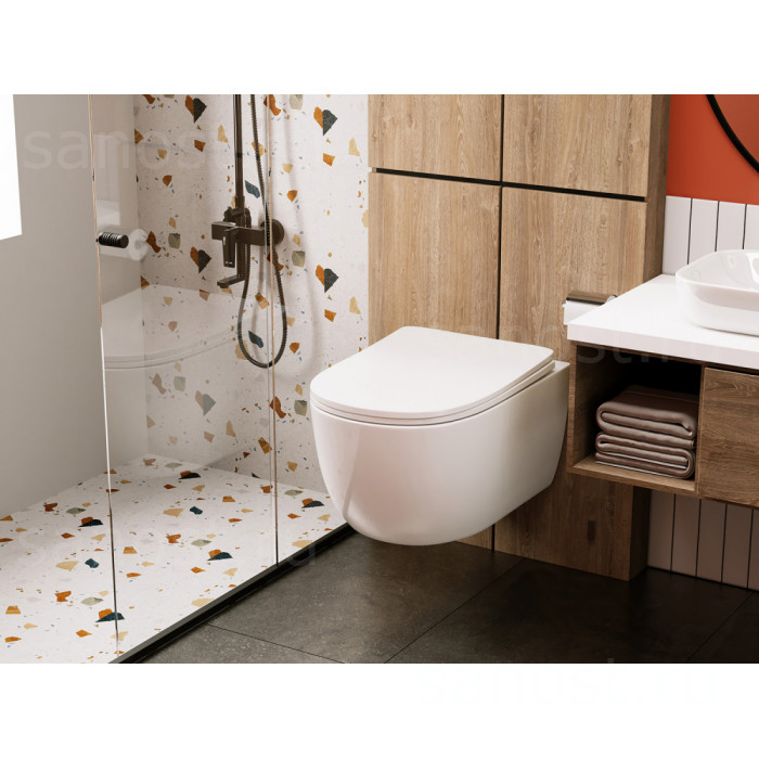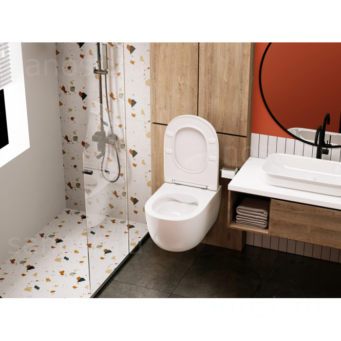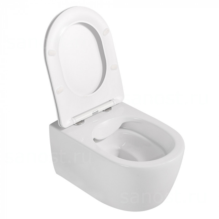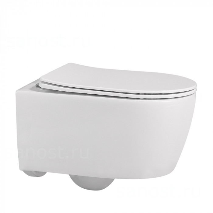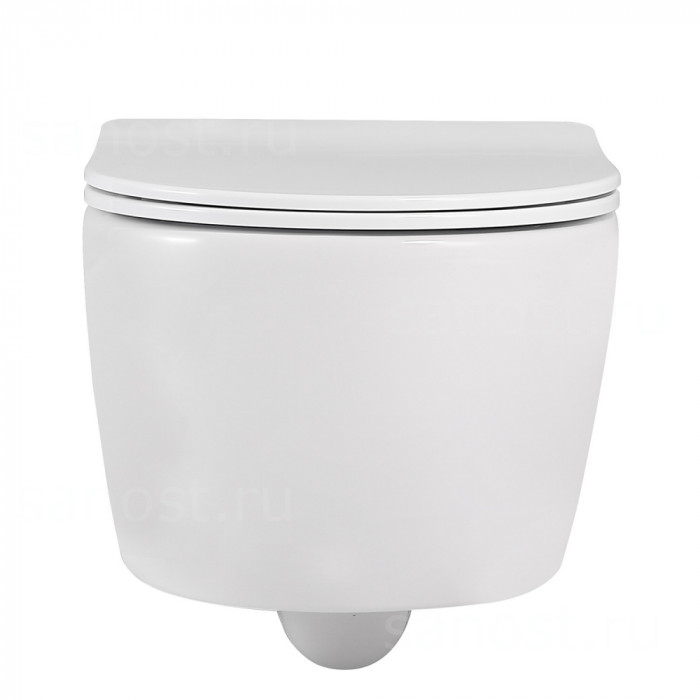 Унитаз ABBER Bequem AC1104 подвесной белый, безободковый, Безободковый, функция Антивсплеск, Антигрязевое покрытие, сиденье в комплекте, режим смыва: каскадный, высококачественная керамика устойчивая к царапинам, температура обжига более 1200°C, металлическая немецкая фурнитура