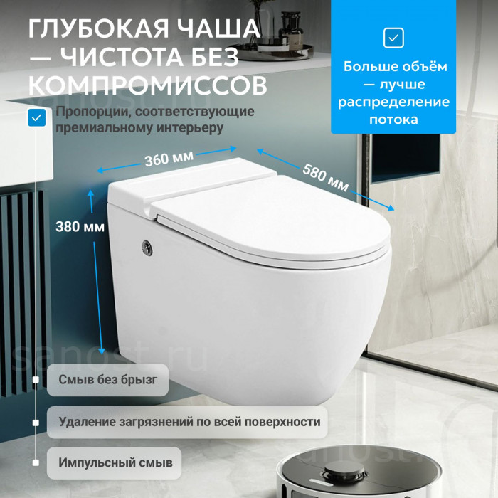 Унитаз ABBER Bequem AC1108P подвесной белый с импульсным смывом, Безободковый, функция Антивсплеск, Антигрязевое покрытие, сиденье в комплекте, режим смыва: импульсный,