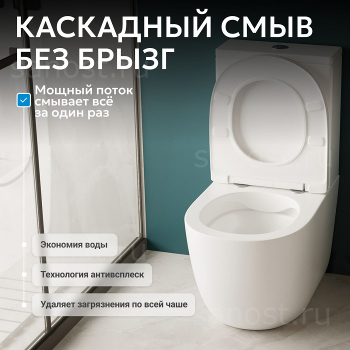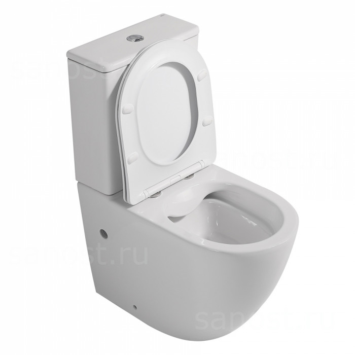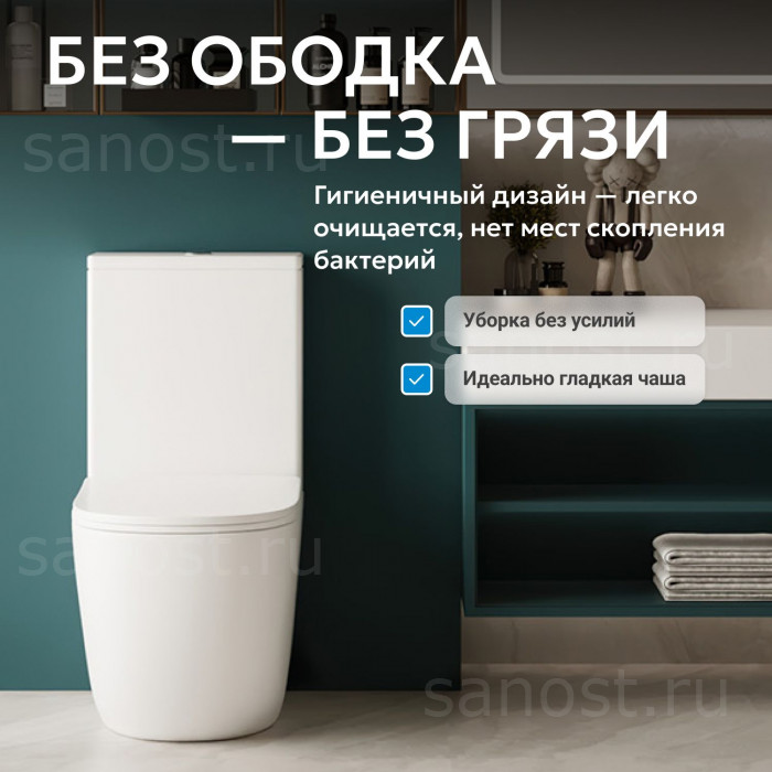 Унитаз ABBER Bequem AC1110 компакт белый, безободковый, Безободковый, функция Антивсплеск, Антигрязевое покрытие, сиденье в комплекте, бачок в комплекте, режим смыва: каскадный, высококачественная керамика устойчивая к царапинам, температура обжига более 1200°C, металлическая немецкая фурнитура