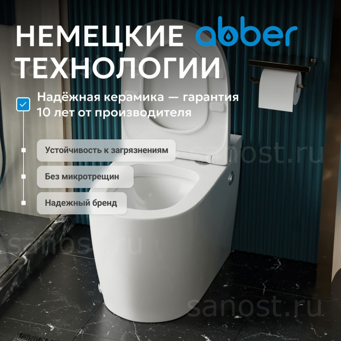 Унитаз ABBER Bequem AC1114P приставной белый с импульсным смывом, функция Антивсплеск, Антигрязевое покрытие, сиденье в комплекте, режим смыва: импульсный, высококачественная керамика устойчивая к царапинам, температура обжига более 1200°C, металлическая немецкая фурнитура