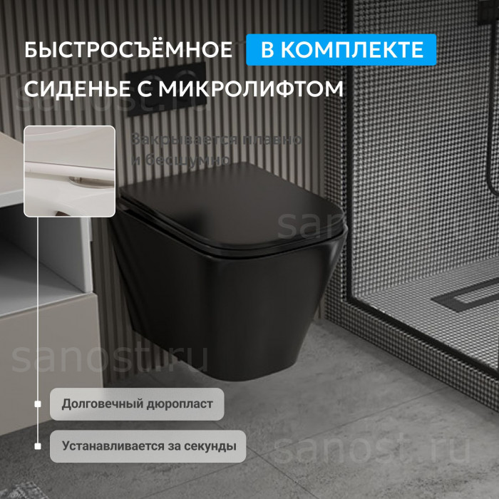 Унитаз ABBER Rechteck AC1201MB подвесной черный матовый, безободковый, Безободковый, функция Антивсплеск, Антигрязевое покрытие, сиденье в комплекте, режим смыва: каскадный, высококачественная керамика устойчивая к царапинам, температура обжига более 1200°C, металлическая немецкая фурнитура