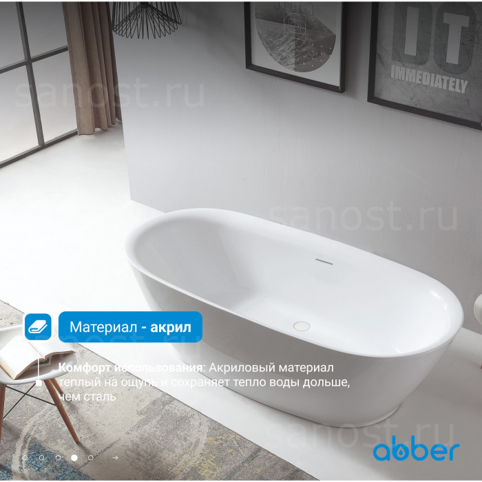 Акриловая ванна ABBER AB9205 белая универсальная отдельностоящая, материал акрил, объём 250 литров. Германия. Гарантия 10 лет.