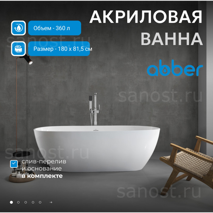 Акриловая ванна ABBER AB9263-1.8 белая универсальная отдельностоящая, материал акрил, объём 360 литров. Германия. Гарантия 10 лет.