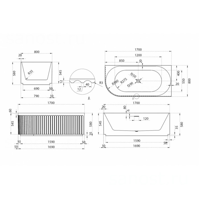 Технические характеристики Акриловая ванна ABBER AB9412-1.7 R белая
