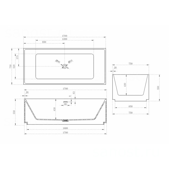 Технические характеристики Ванна из искусственного камня ABBER Stein AS9602 белая матовая