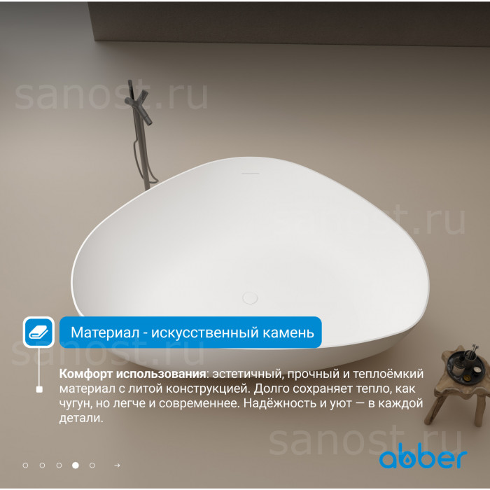 Ванна из искусственного камня ABBER Stein AS9608 белая матовая универсальная отдельностоящая, материал искусственный камень, объём 320 литров. Германия. Гарантия 10 лет.