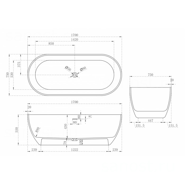 Технические характеристики Ванна из искусственного камня ABBER Stein AS9613-1.7 белая матовая