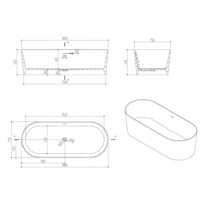 Технические характеристики Ванна из искусственного камня ABBER Stein AS9614 белая матовая