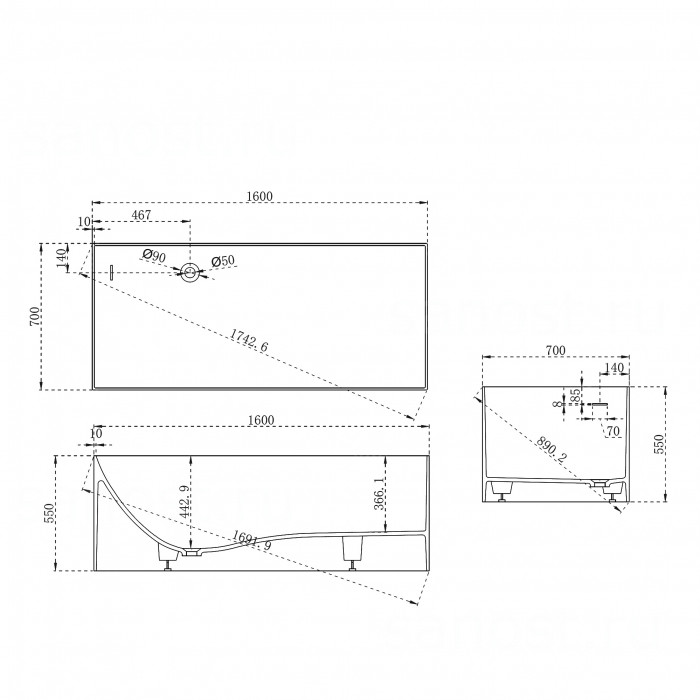 Технические характеристики Ванна из искусственного камня ABBER Stein AS9640-1.6 белая матовая