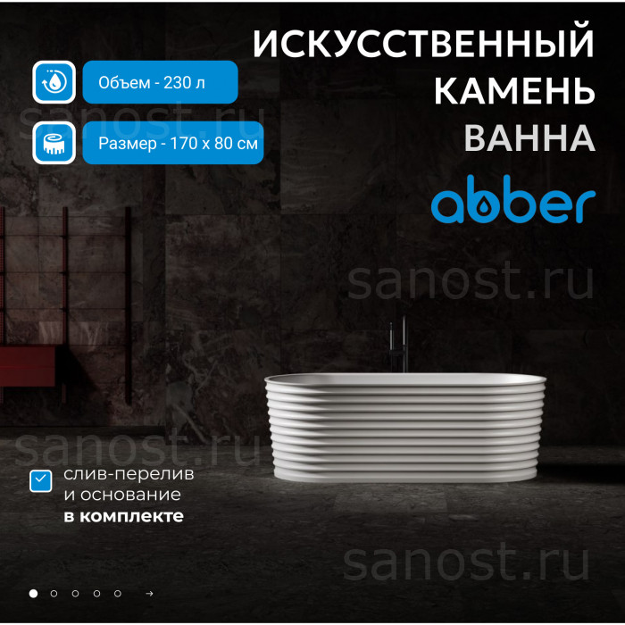 Ванна из искусственного камня ABBER Stein AS9650 белая матовая универсальная отдельностоящая, материал искусственный камень, объём 230 литров. Германия. Гарантия 10 лет.
