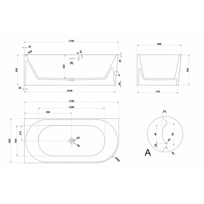 Технические характеристики Ванна из искусственного камня ABBER Stein AS9651 L белая матовая